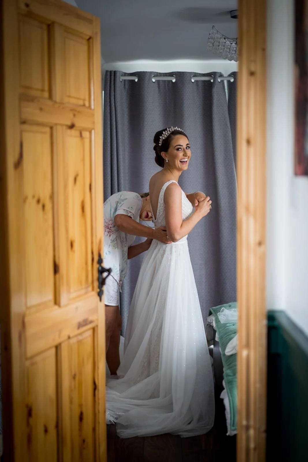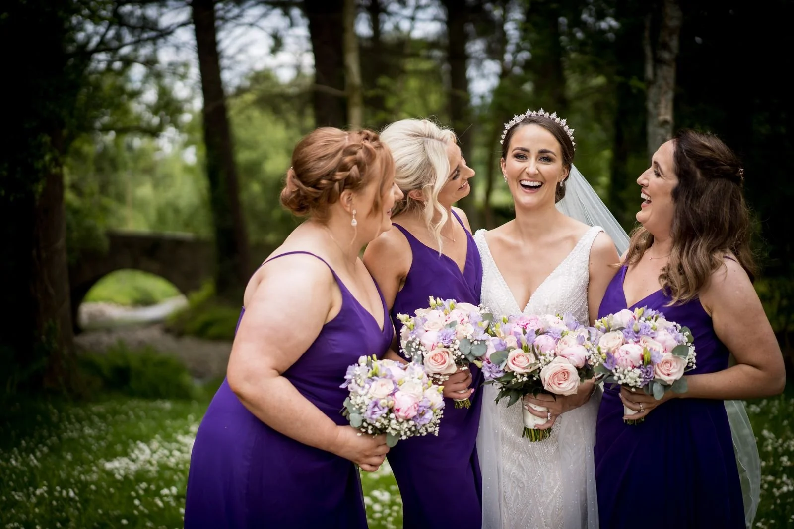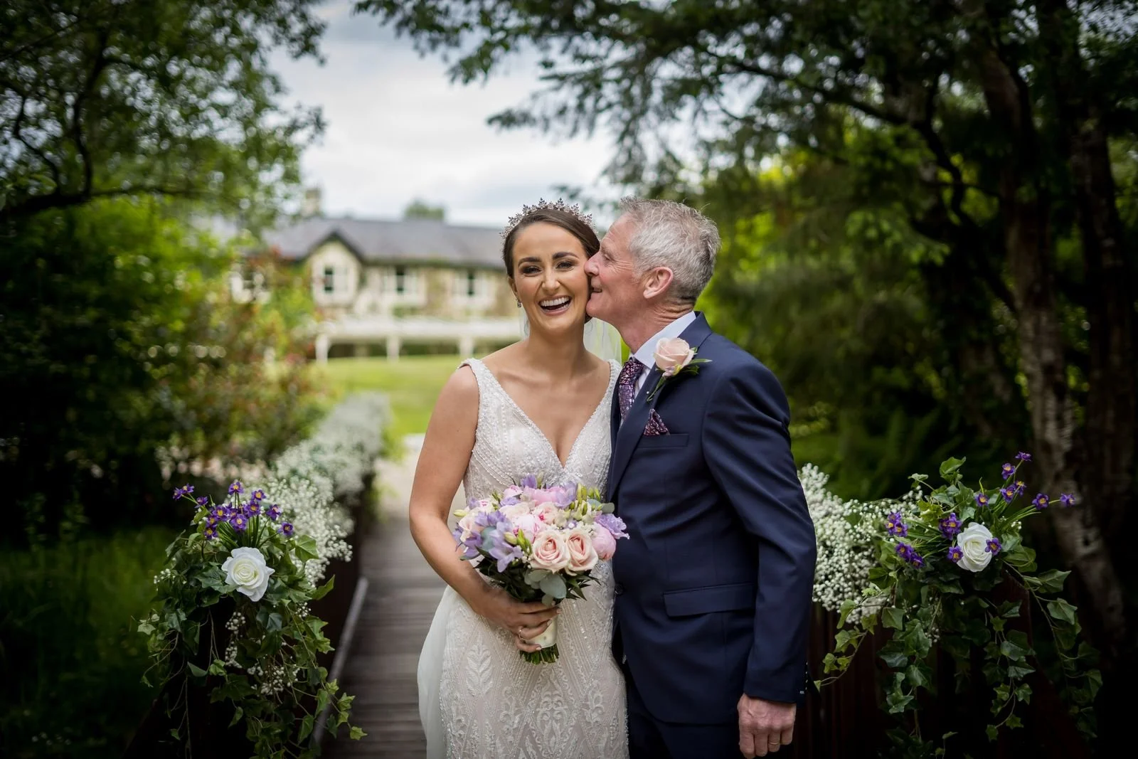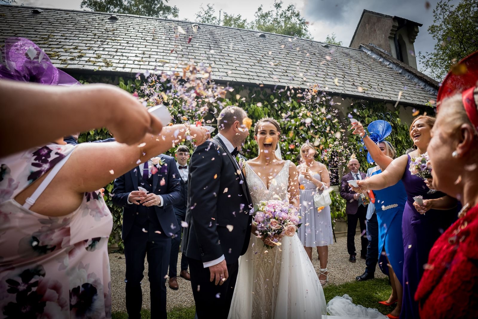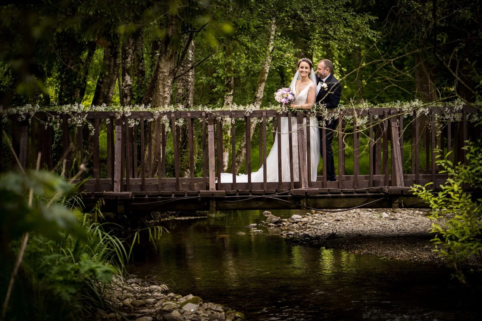Natalie and Alan’s wedding at Brooklodge and Macreddin Village in Co. Wicklow was relaxed, romantic, and full of summer atmosphere. Their ceremony took place in the charming chapel on the island in Macreddin Village, surrounded by flowing water and a picturesque bridge. Confetti after the ceremony added a fun and joyful moment for everyone.