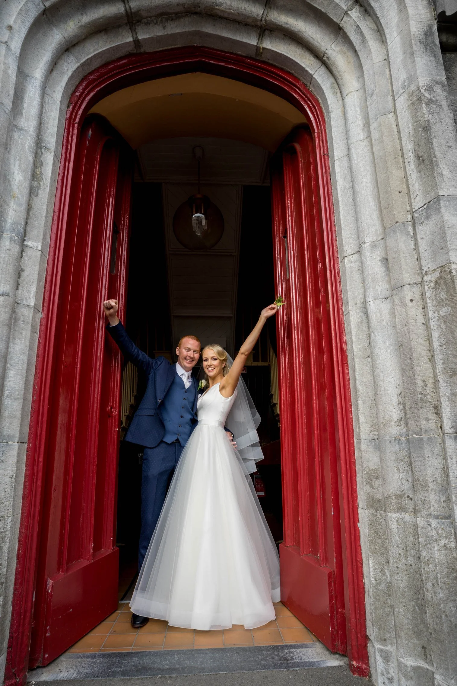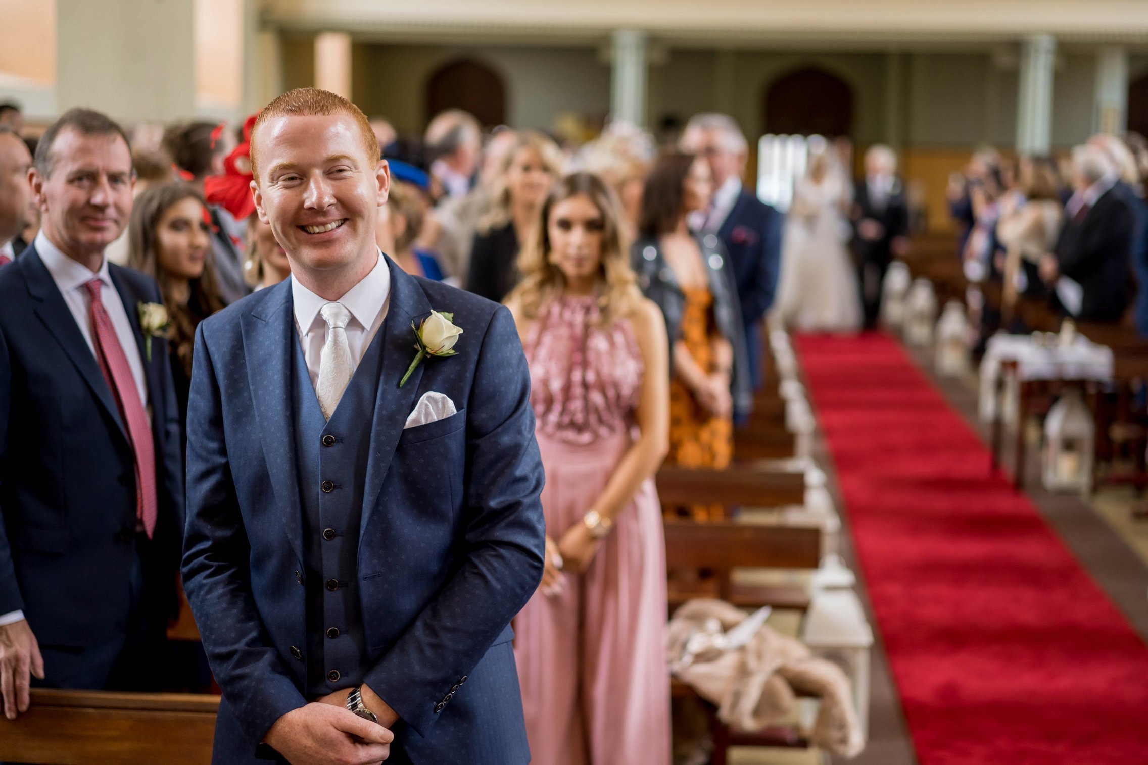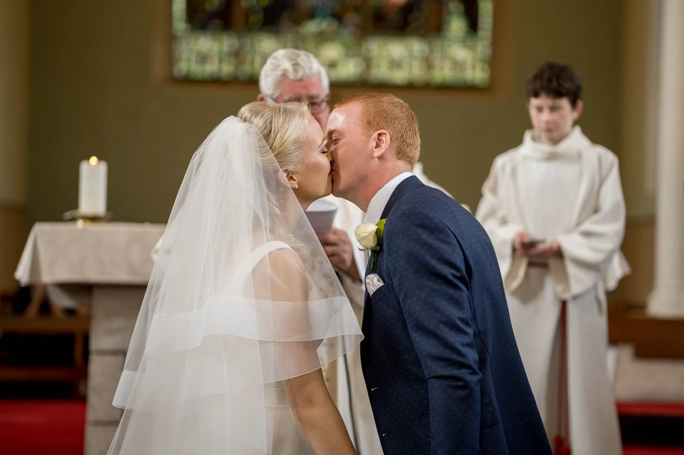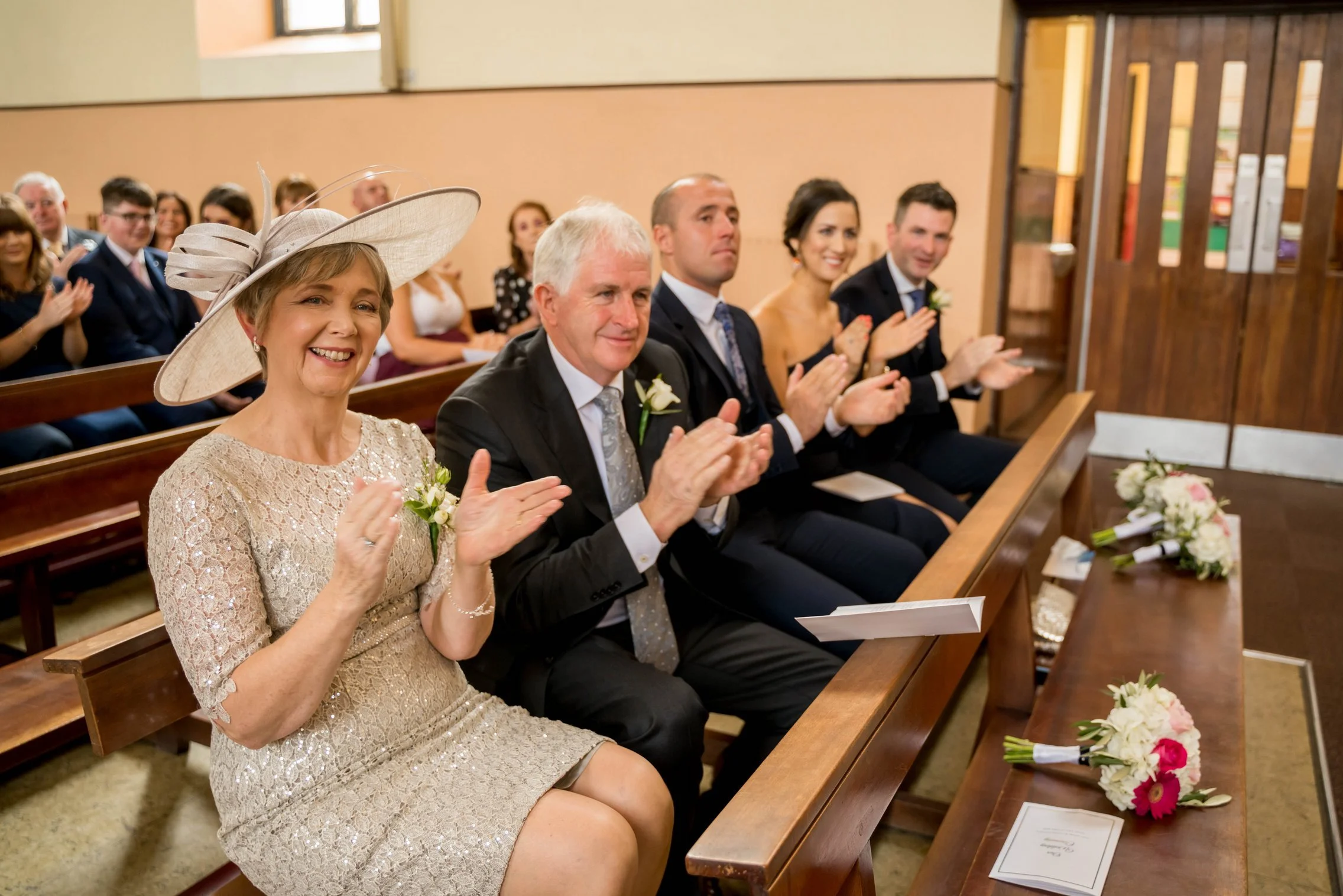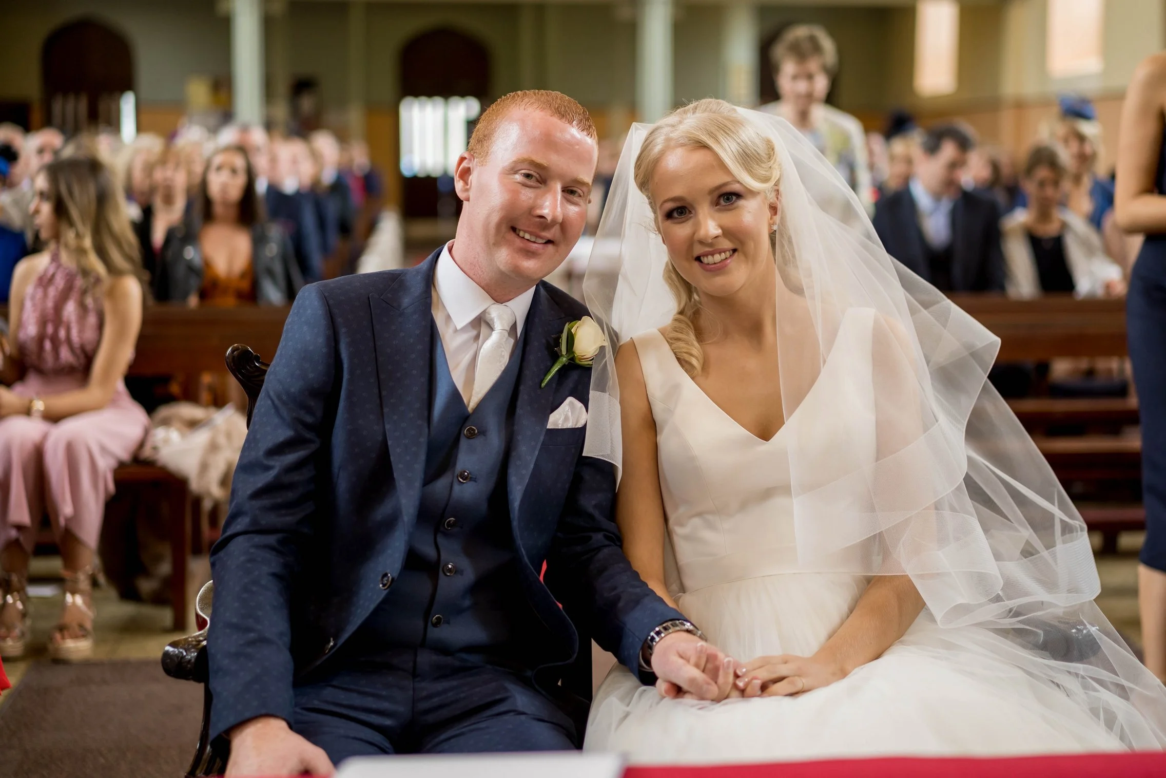 Once Kate was ready, we headed to the church where she arrived with her father. The ceremony was intimate and beautiful — rings were exchanged, vows spoken, and the first kiss welcomed with applause. After they signed the registry, we gathered everyone for a large group photo with all their guests, creating a timeless keepsake of that special moment.
