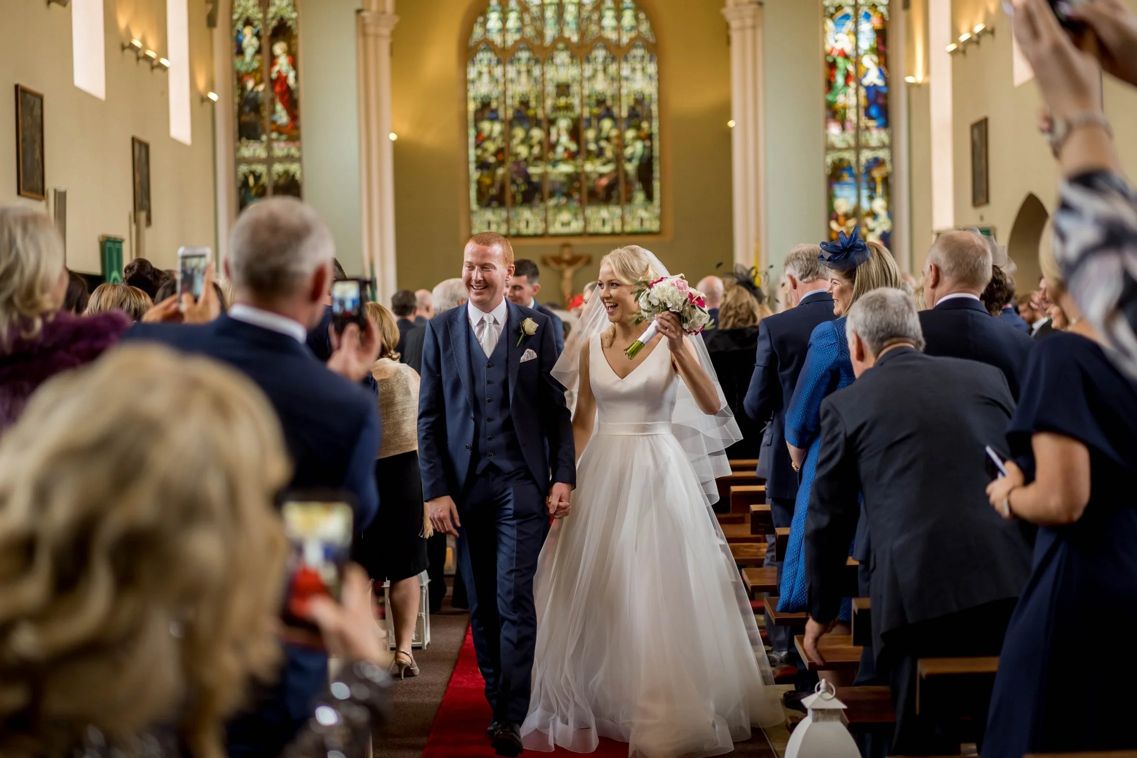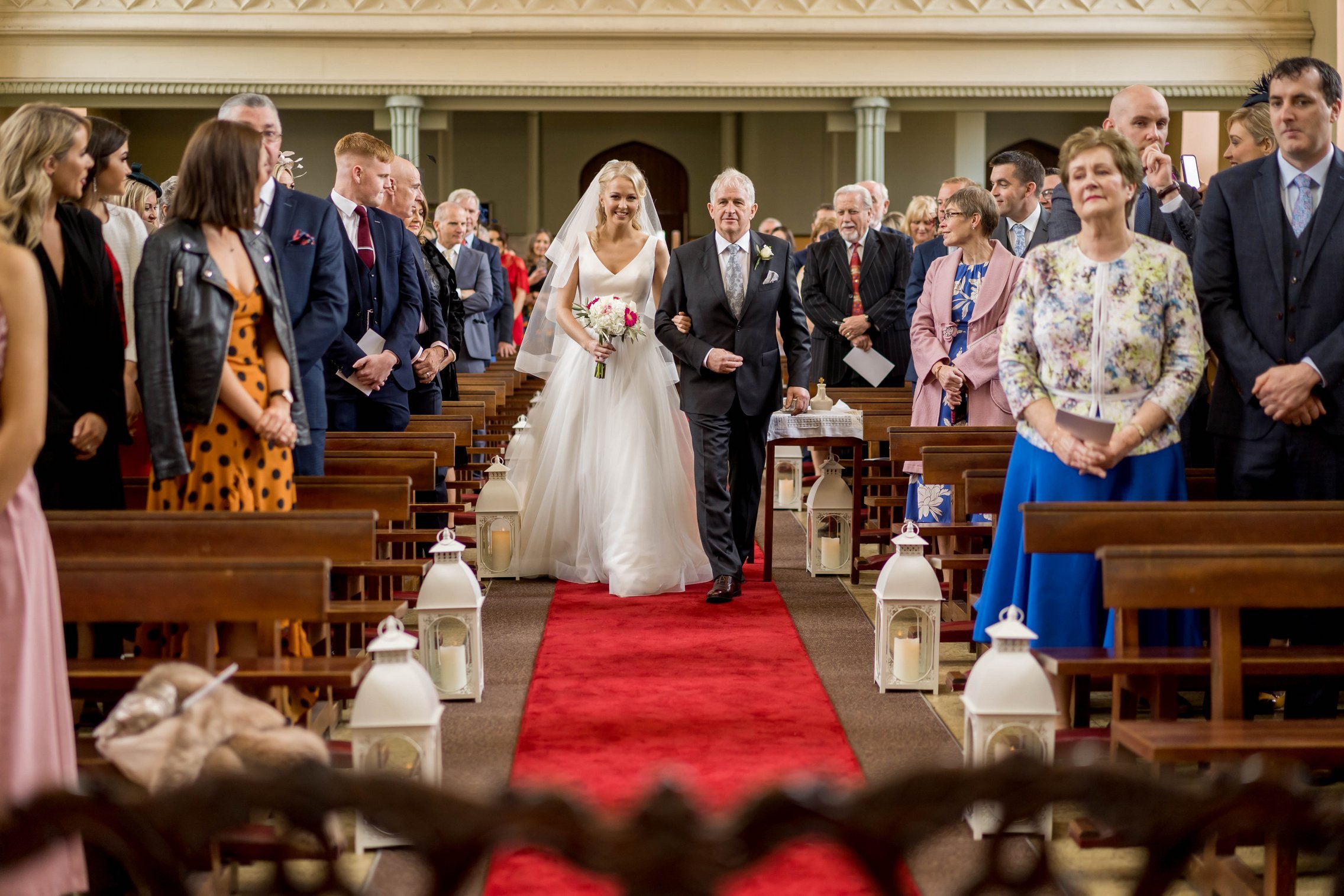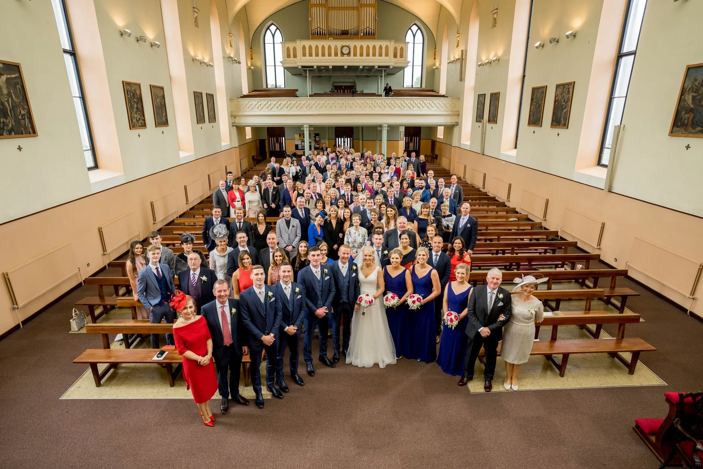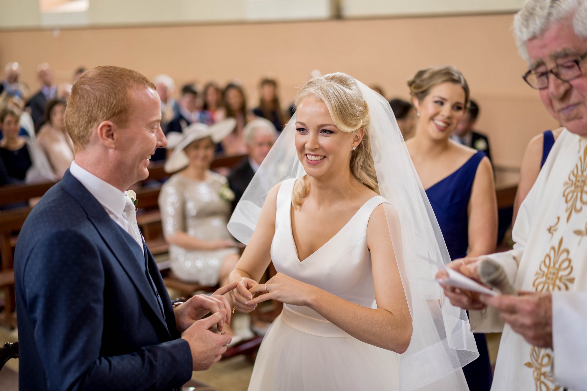 Once Kate was ready, we headed to the church where she arrived with her father. The ceremony was intimate and beautiful — rings were exchanged, vows spoken, and the first kiss welcomed with applause. After they signed the registry, we gathered everyone for a large group photo with all their guests, creating a timeless keepsake of that special moment.