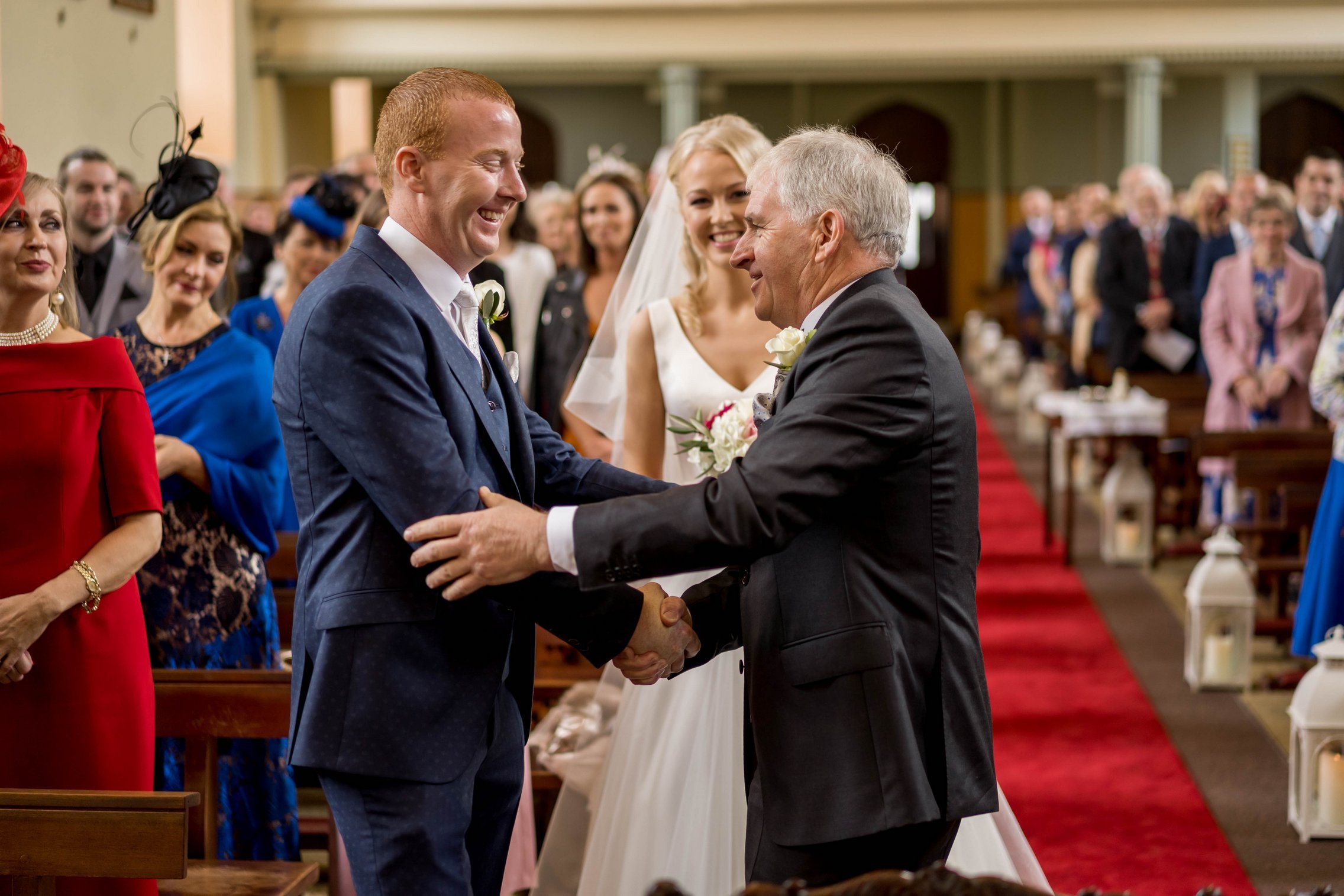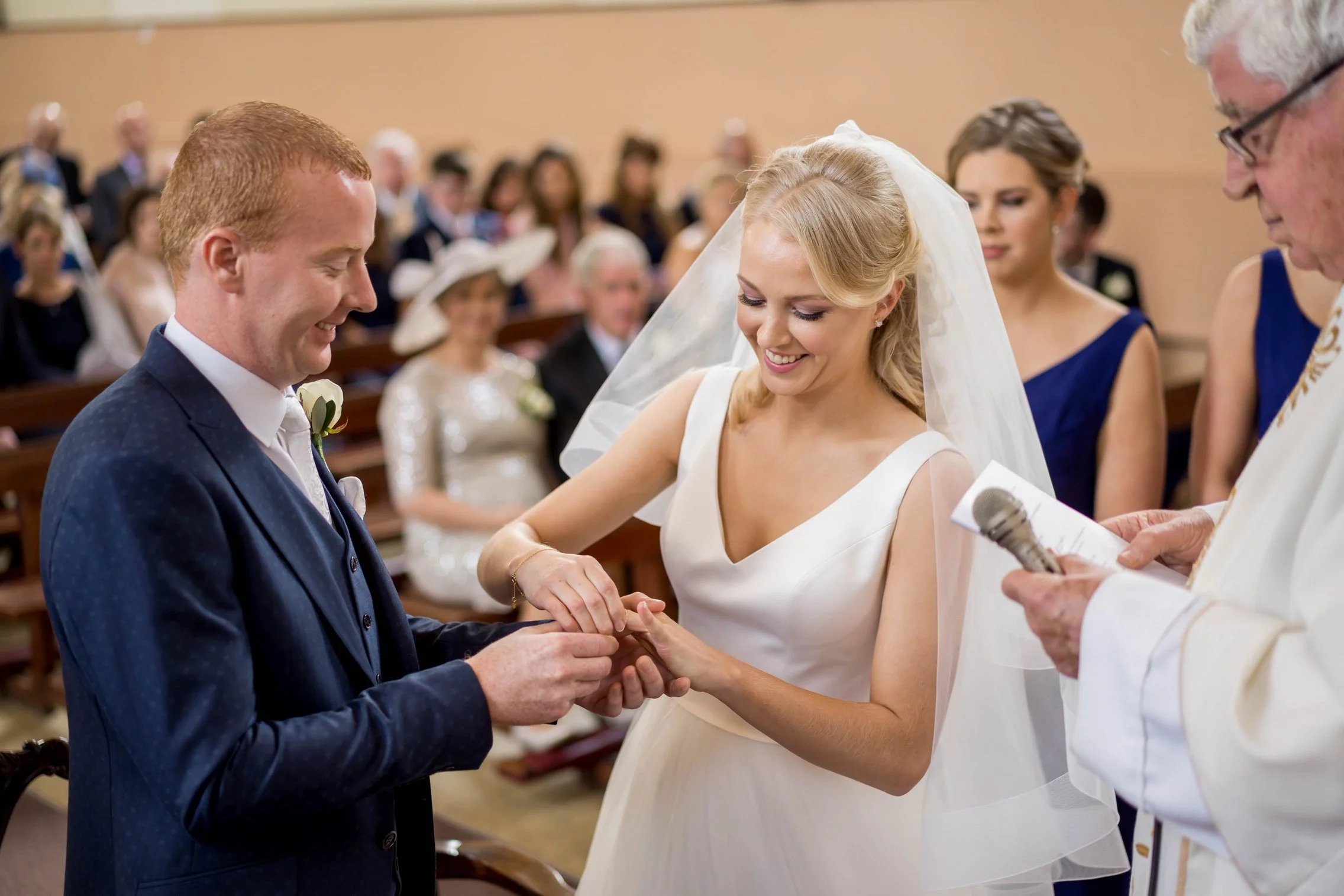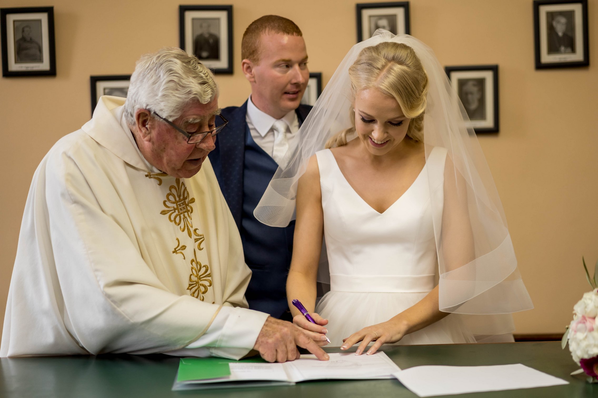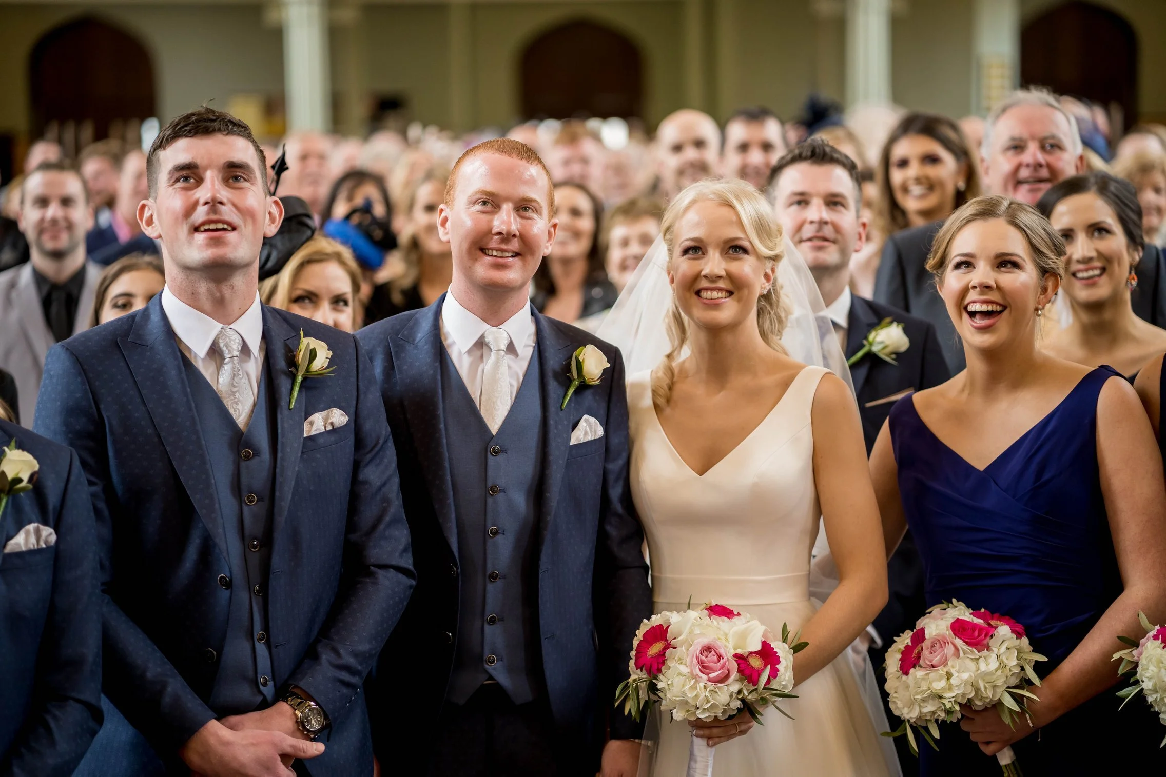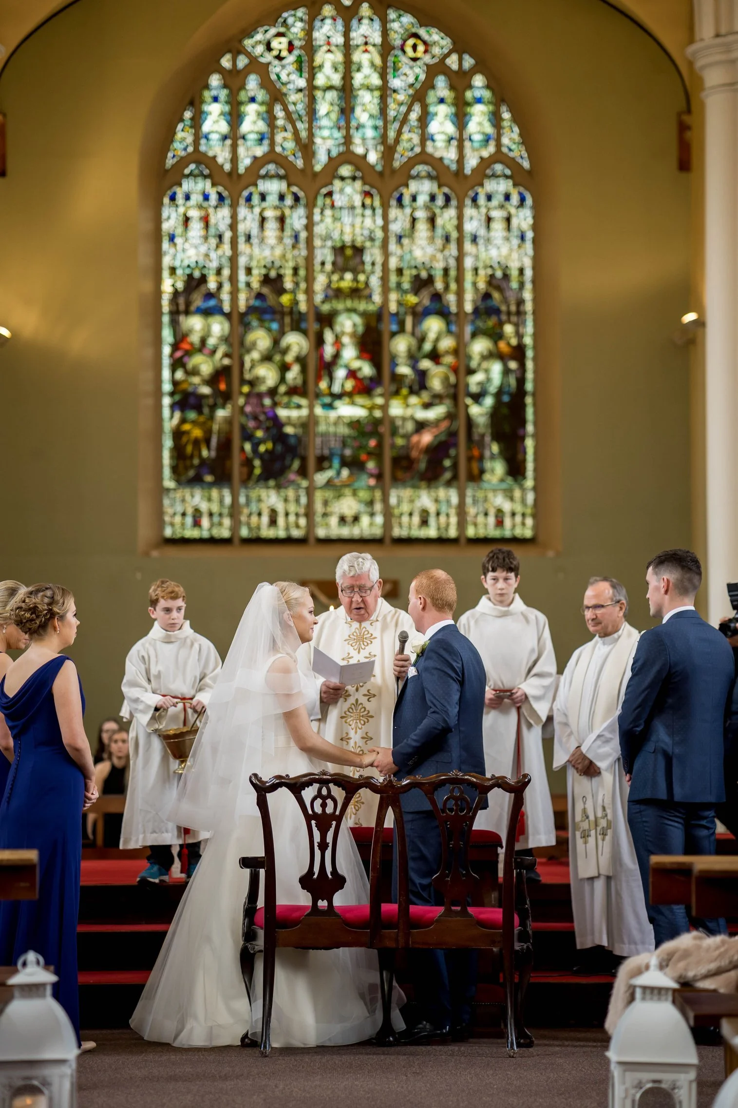 Once Kate was ready, we headed to the church where she arrived with her father. The ceremony was intimate and beautiful — rings were exchanged, vows spoken, and the first kiss welcomed with applause. After they signed the registry, we gathered everyone for a large group photo with all their guests, creating a timeless keepsake of that special moment.