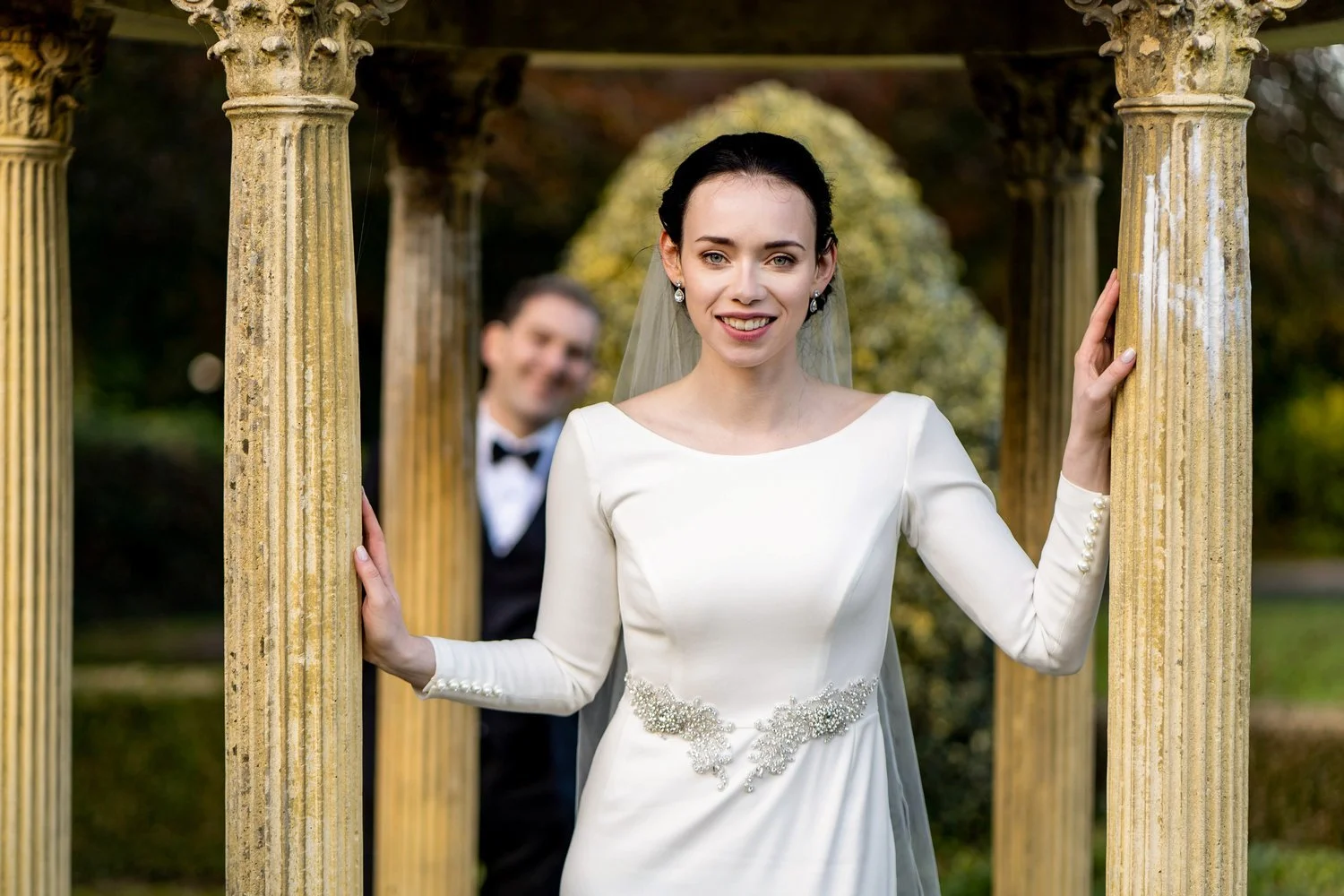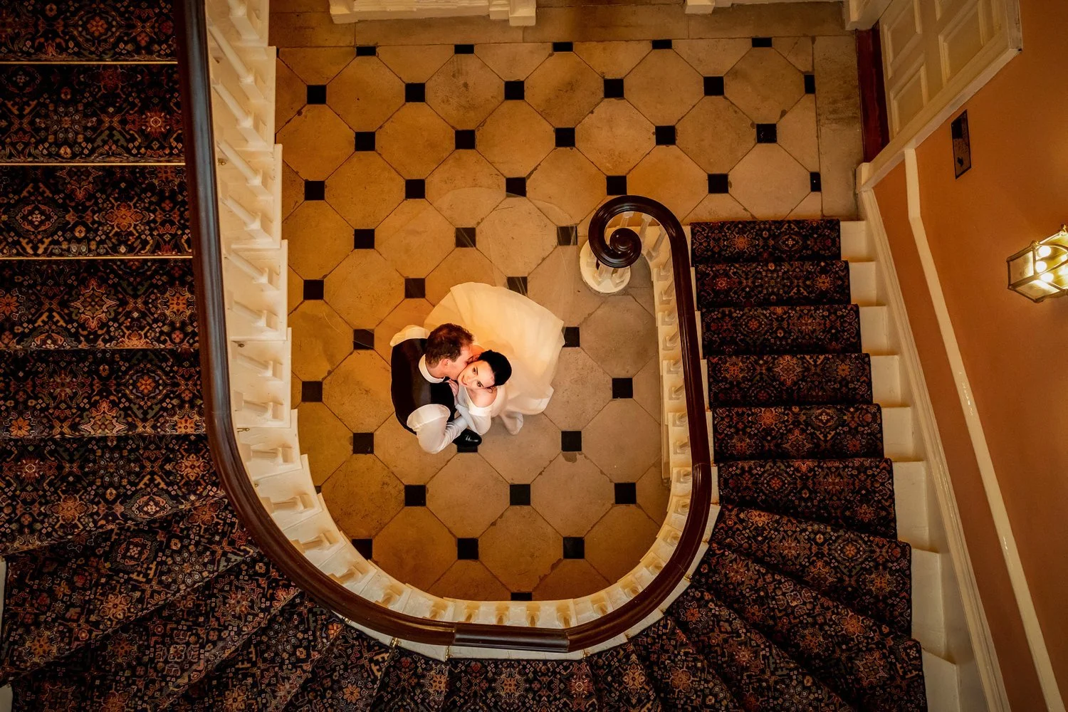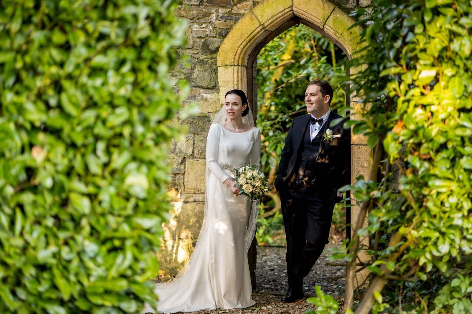 As the day moved into evening, the light softened and the atmosphere became even more romantic. We took a few quiet moments for evening portraits, including a timeless shot on the staircase inside the hotel and relaxed outdoor photos in the gardens, just as the sun was setting. These calm, atmospheric moments are always a favourite part of the day and a beautiful way to slow things down before the celebrations continue.