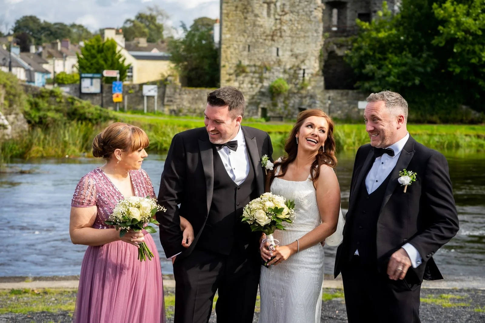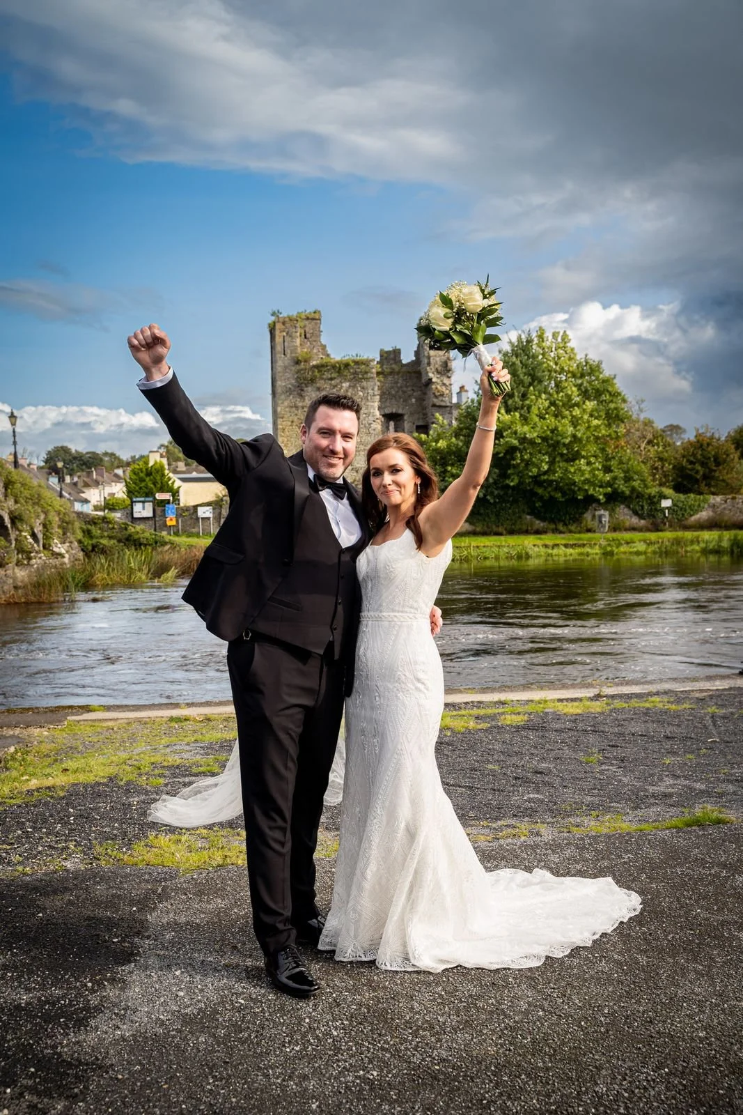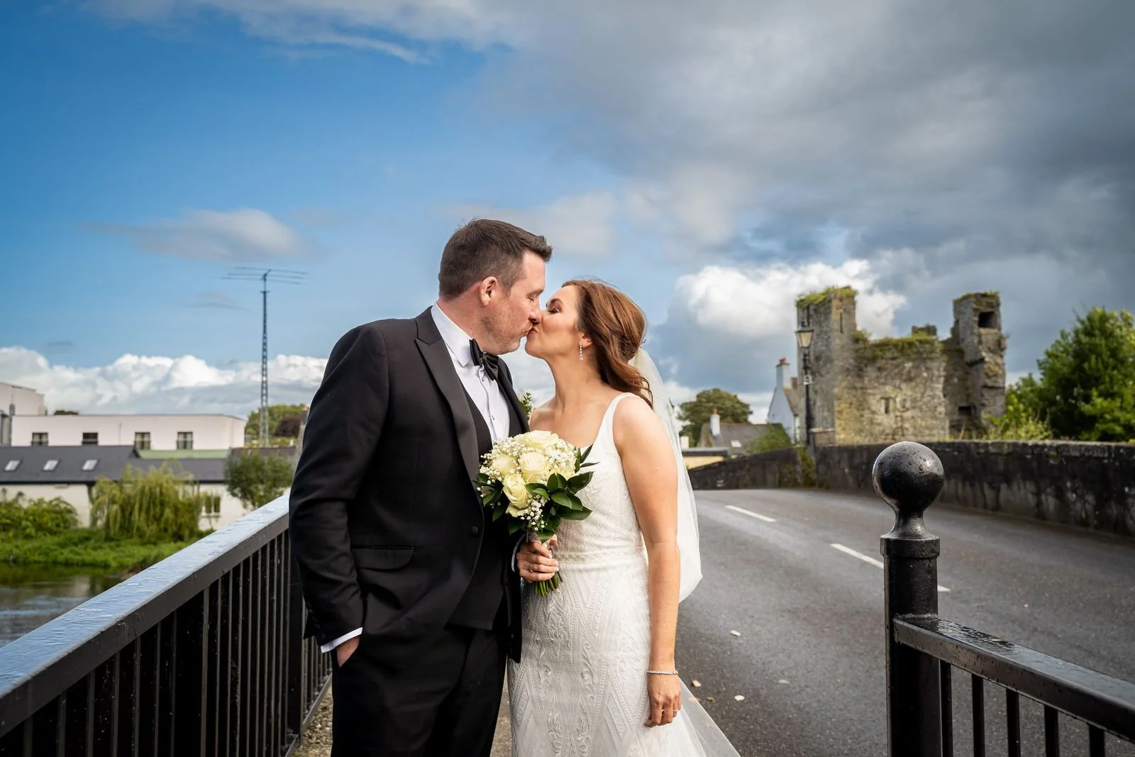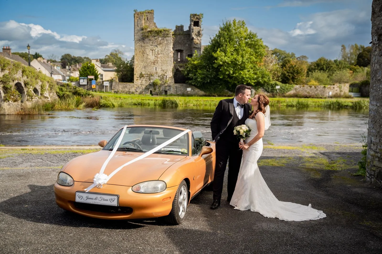 After the ceremony, Fiona and James jumped into their sports car and made their way towards the reception. On the way to the hotel, we made a short stop on the bridge on the main street of Leighlinbridge village for a few photographs. This was a lovely, spontaneous moment and a great way to capture some relaxed couple portraits in a place that means something to them.