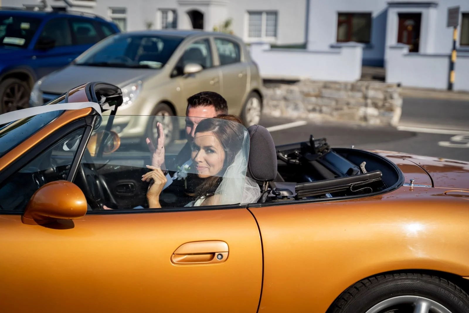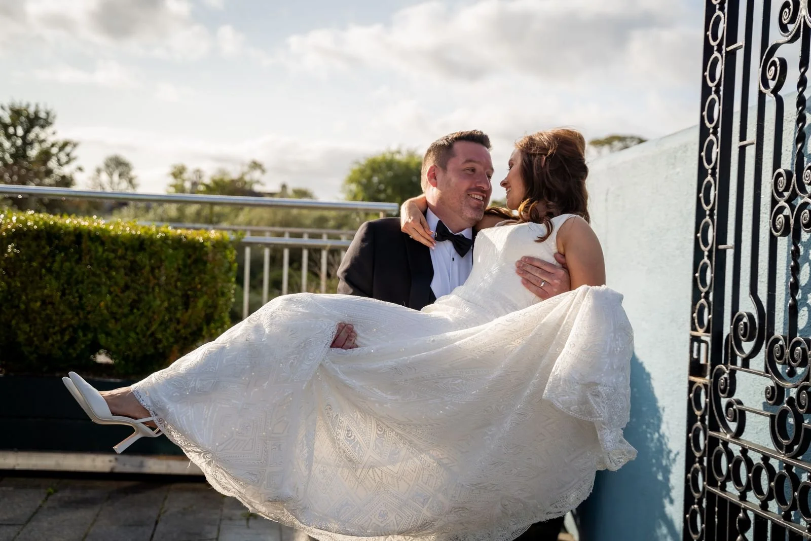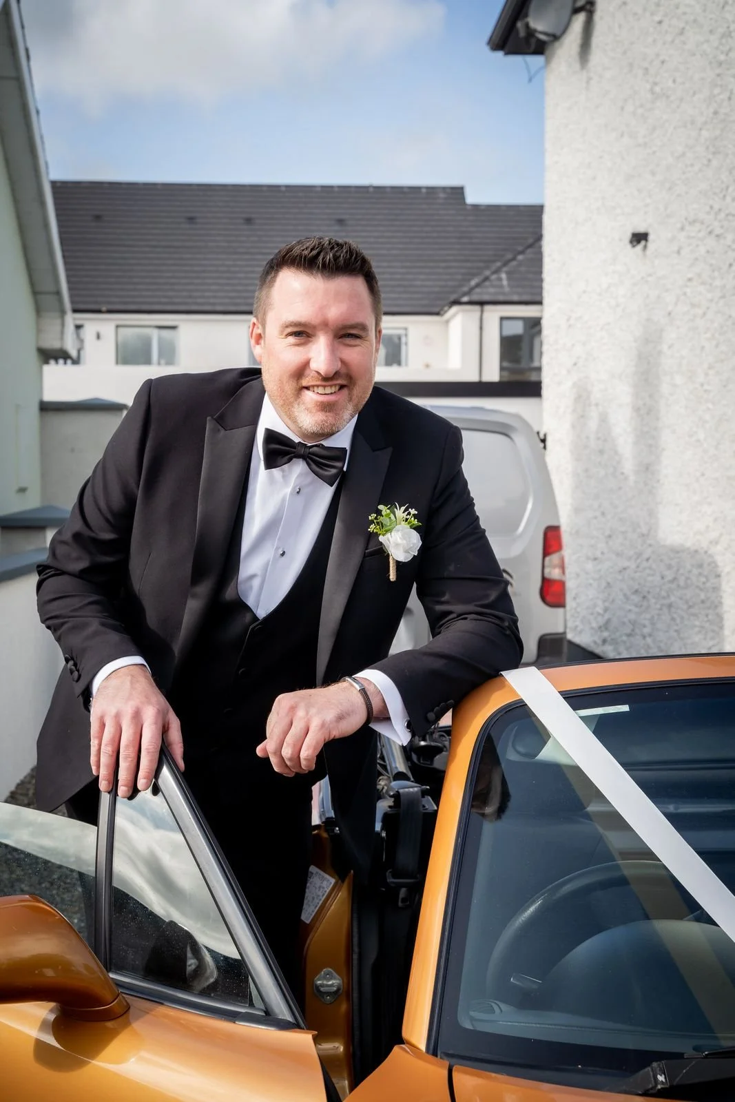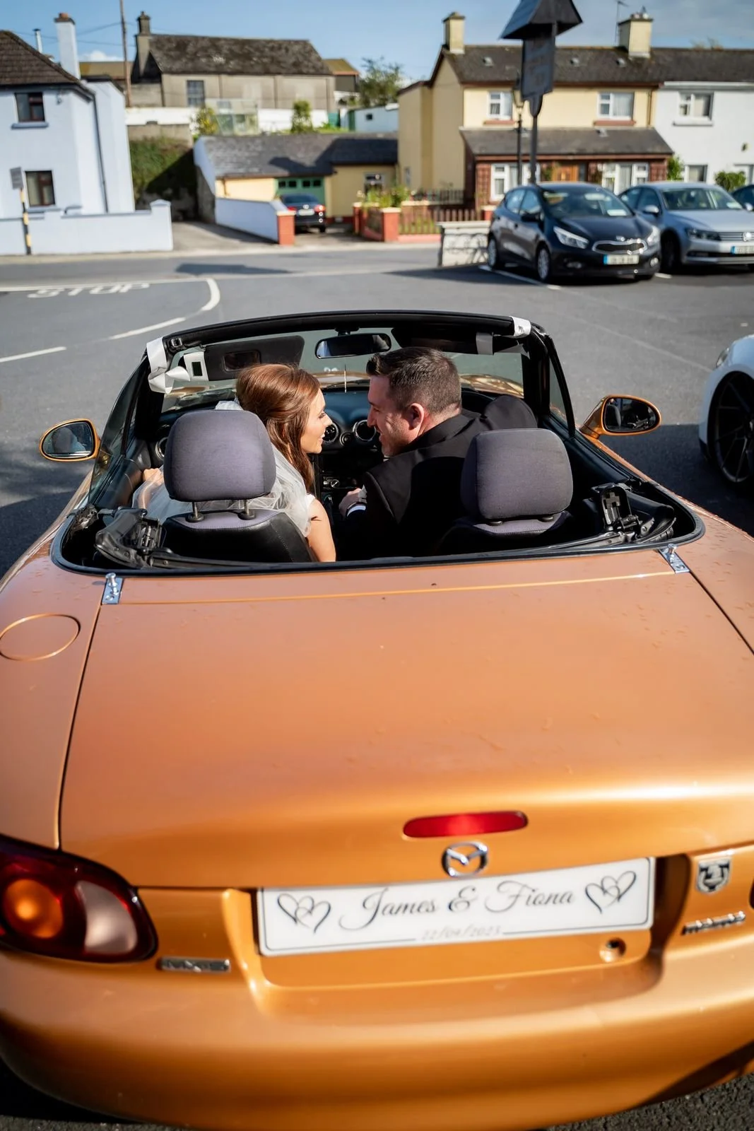 After the ceremony, Fiona and James jumped into their sports car and made their way towards the reception. On the way to the hotel, we made a short stop on the bridge on the main street of Leighlinbridge village for a few photographs. This was a lovely, spontaneous moment and a great way to capture some relaxed couple portraits in a place that means something to them.